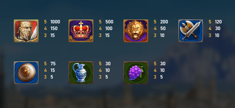สัญลักษณ์รูป นักรบ เป็นสัญลักษณ์ที่ให้อัตราจ่ายรองลงมาจากมงกุฏของเกม ROMA ไม่รวมสัญลักษณ์ Bonus และ สัญลักษณ์ Wild จะให้อัตราเดิมพัน ตั้งแต่ 3-5 อัน จะได้โบนัสคะแนน 15 150 1,000