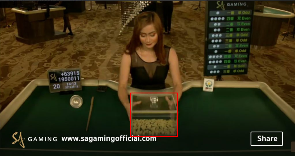 โดย ดีลเลอร์ สาวสวยของเรา จะทำการสุ่มเม็ดถั่ว ตามที่เห็นในภาพด้านบน ในการเลือกให้เม็ดถั่วทุกเม็ดนั้นคละกัน โดยจะเขย่าสักครู่ โดยใช้กล่องพลาสติกใส ในการเขย่าเพื่อให้ผู้เล่นหรือผู้เดิมพันได้มองเห็นทั้งหมด